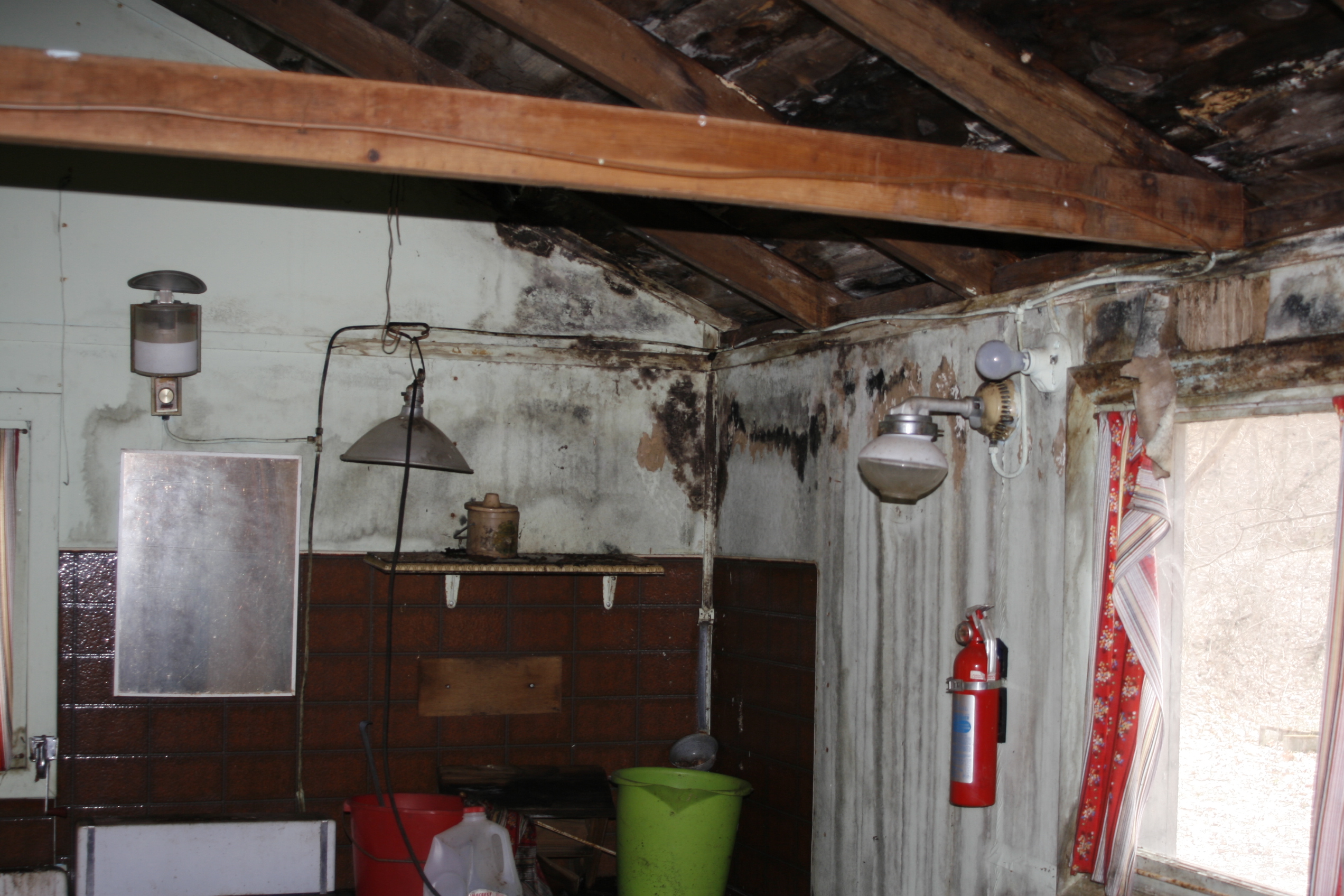 Once we can get the vehicles across the creek, getting back to where my cabin in located is not much of a problem. Currently there are two cabins and two sheds located in the clearing. My plan is to tear one of the cabins and both sheds down. Then what to do with the main cabin is still a little up in the air. My initial thought was to gut the inside and replace the roof. Then I noticed what appears to me like black mold and this concerns me a lot. So I'm not sure what I'm going to do and I'm definitely open to suggestions.