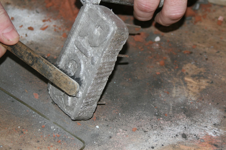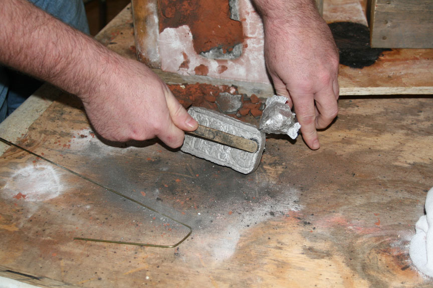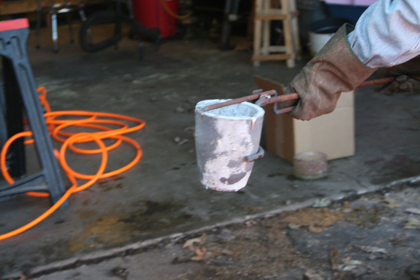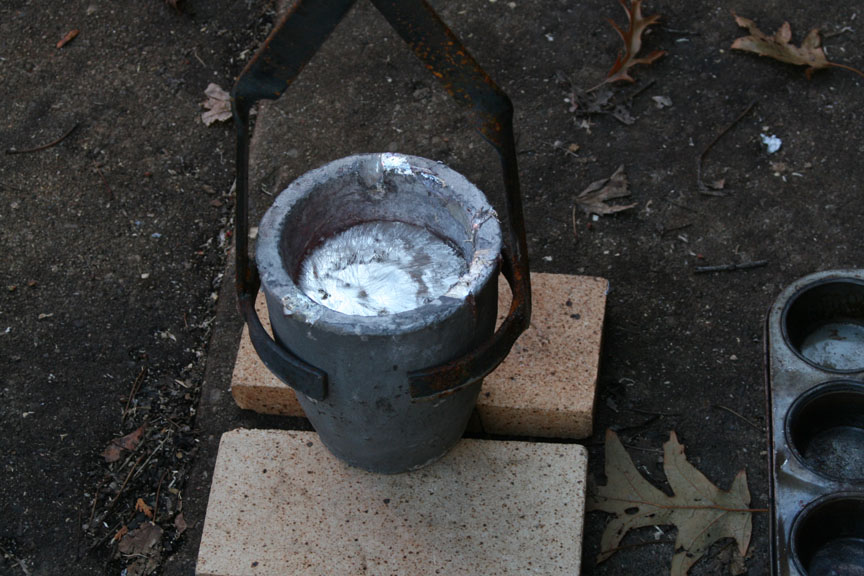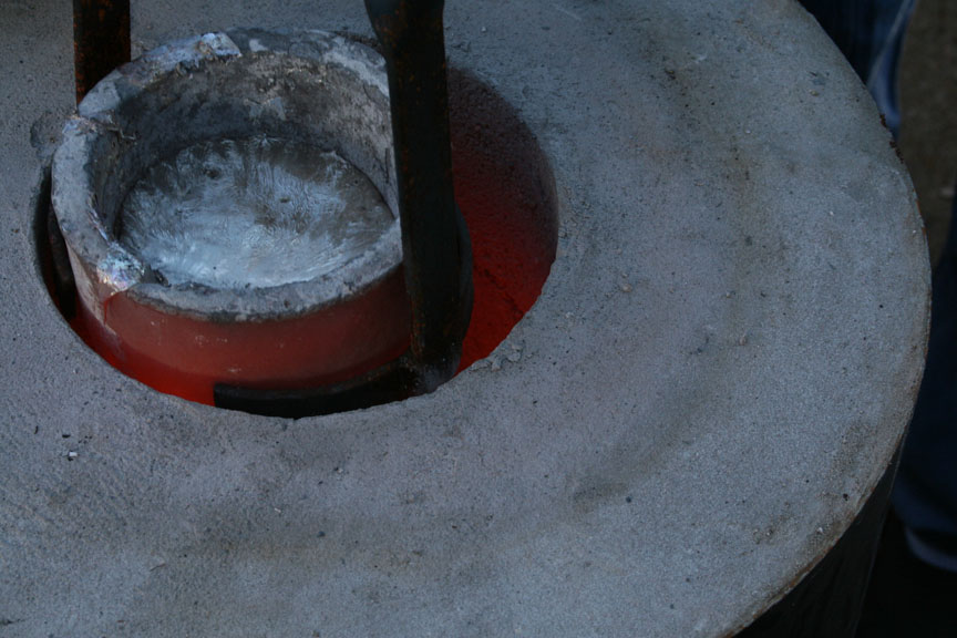 After a bit the ignots melted, the liquid was skimmed to get the crud out and it was time to withdraw the crucible in anticipation to make my first pour.
