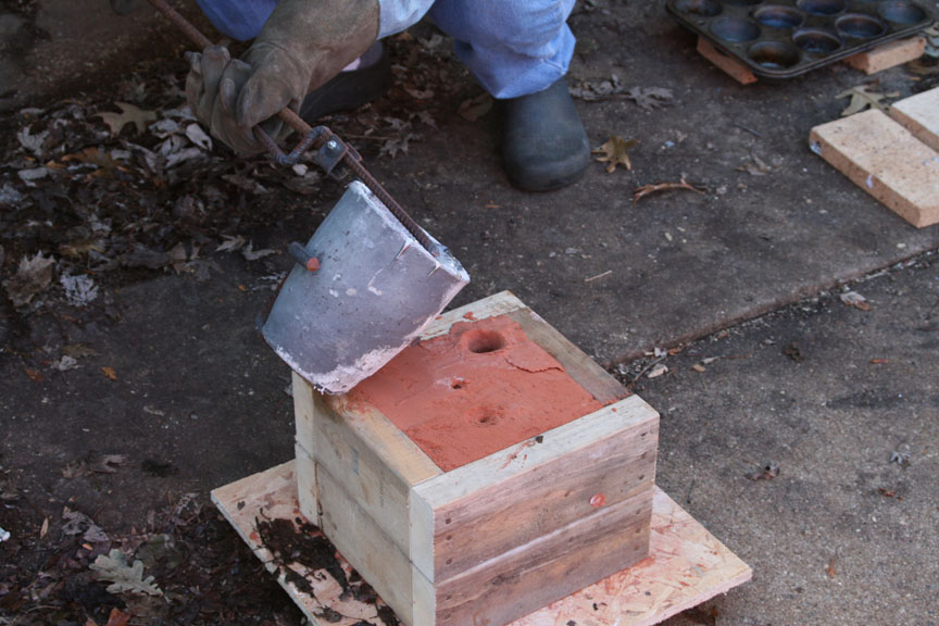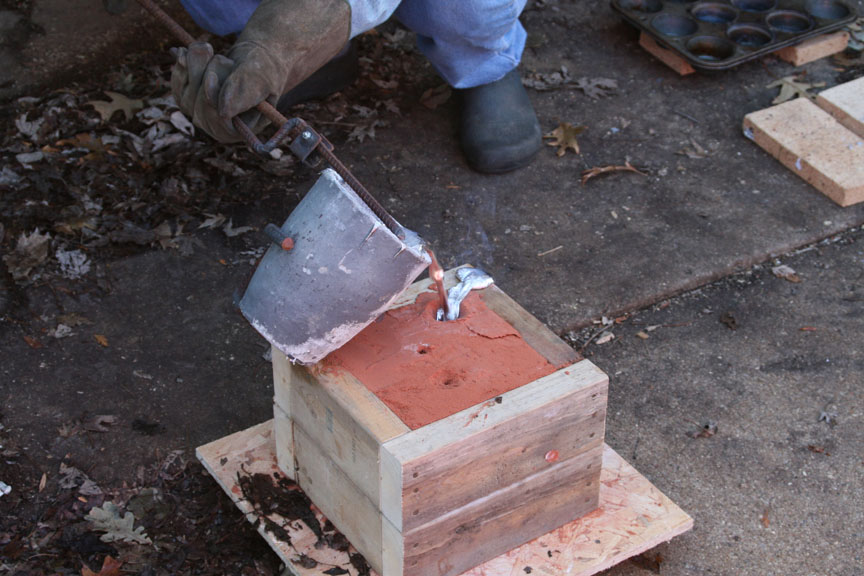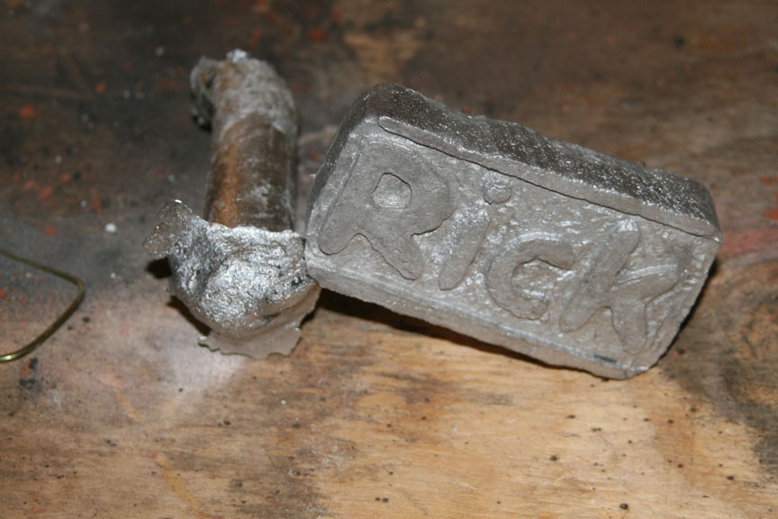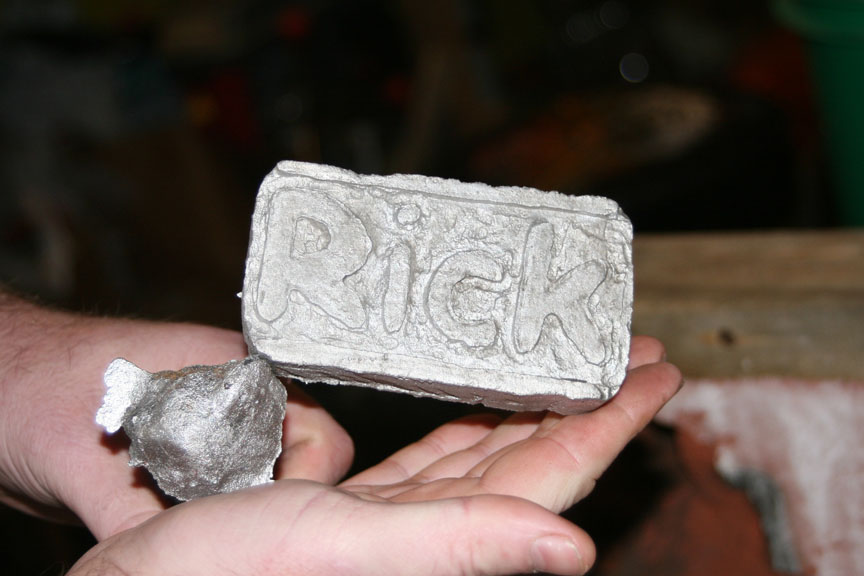 Now...I placed the foam design into a mold. I had purchased some Petrobond molding sand and was excited to use it. I placed the foam design in, then formed the Petrobond molding sand all around it to make the mold. Initially I had thought about removing the foam and utilizing the benefits of the Petrobond sand, but I couldn't get it out even though I used some parting powder so I decided to go ahead and leave the foam in. I cut a hole for the metal to flow down into the mold and prepared the rest of the mold. Again, unfortunately too busy to take pictures. I needed my assistant to take pictures, but she was busy making lunch! LOL
