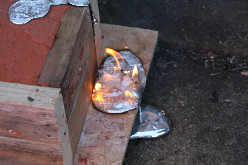 You can see the crucible is still an orange color. When it is still in the furnace it is bright orange. The aluminum is shinny silver; it reminds me of how mercury looks inside the old thermometers.
