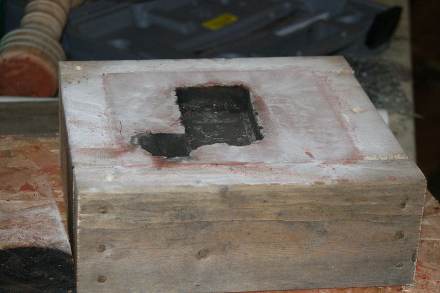 Below is what the inside of the mold look like. Note the blackend area, this is the burnt sand I was talking about. There was a strong odor of burnt plastic which I assume was from the foam melting away. It was pretty strong and stayed around for quite a while.